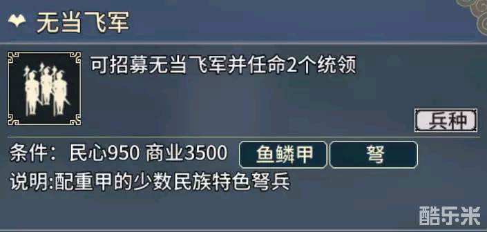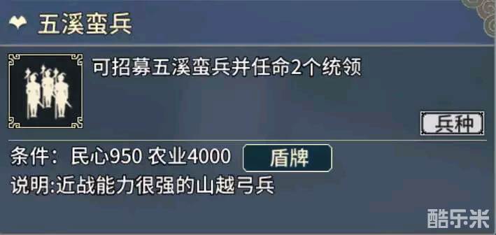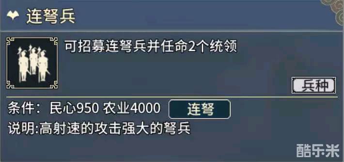 使用:荆州附近的中小势力优先获得,南方的士家和东边的孙家也可以较快夺取。一般用作配合兵种,不是攻防主力。