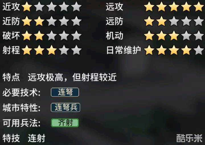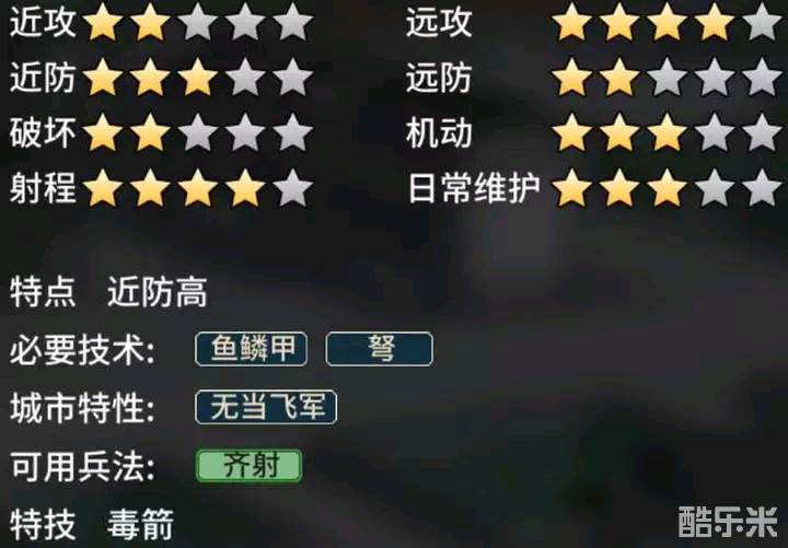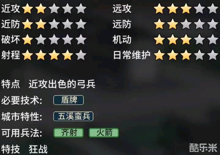 优点:脚程快、有一定近战能力的弓兵,虽然攻防都一般,但特技是一发常规攻击能打在射程范围内最多三支敌方部队,因此特别适合混战,对只剩下几百人的敌兵进行补刀。