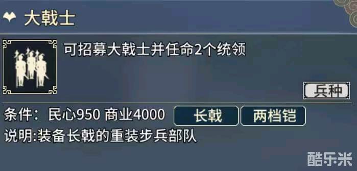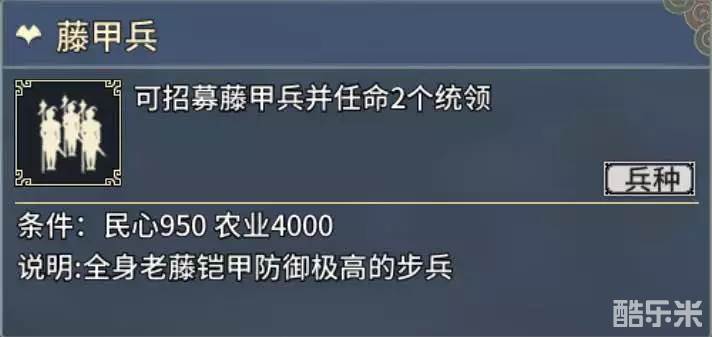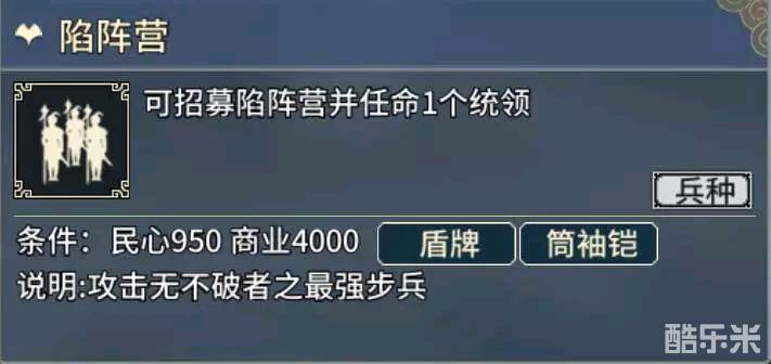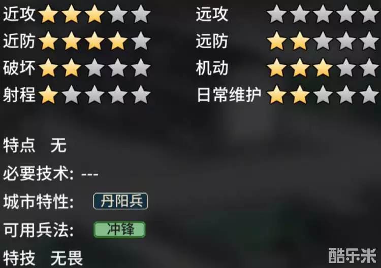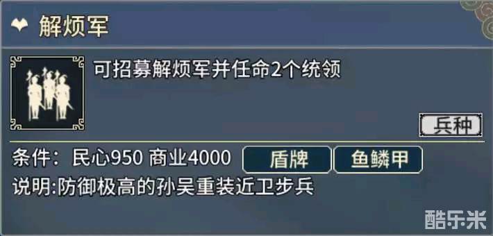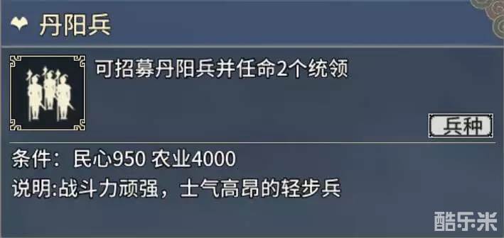 使用:东部最强步兵虽然不是它(而是解烦军) ,可是四个虎符量足,步兵适应性强堪为战场主力。中东部大部分势力取得广陵很easy,而东吴老家建业又是值得发展的大城,所以丹阳-解烦组合和西部的连弩-无当组合一样都是战场主角。