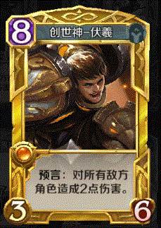 是谁无数次拯救我们于危难之中?就是他!专业收割残血的伏羲~游戏中的最强卡牌,出场自带AOE预言效果,。即便对手强势战场,如果角色牌血量稍有不过关,伏羲就能发动团灭翻盘给你看!当然,这张金卡获取颇有难度,打到最强王者才能拥有哦~
