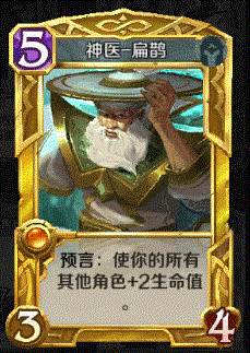 扁鹊出场率一直居高不下,带上他对整套牌组的质量都会有一个明显提升,1阶都有3攻3血,即使前期裸上都不亏。当然如果在你占据场面后登场,对手基本可以投降了。