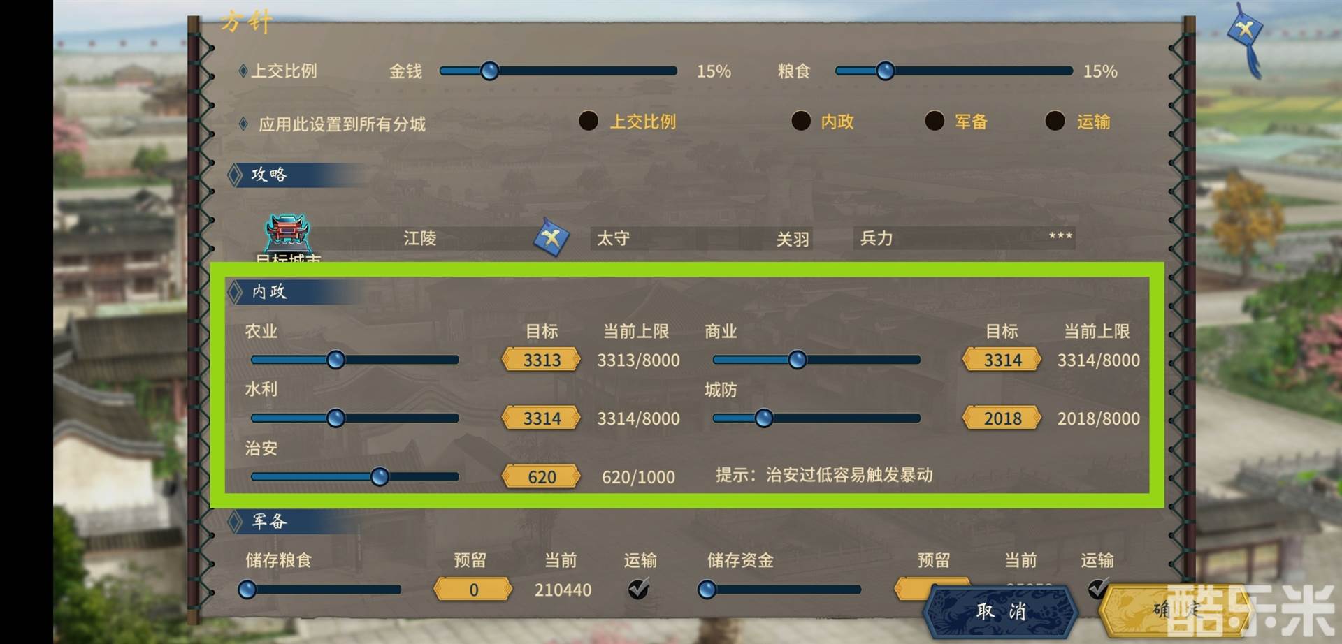 自动内政的内政,需要城市有充足钱。2万以上才可以达到最大值,所以经济不紧张的时候,保留分城至少二万的钱。