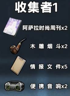 收集者1:2个阿萨拉时尚周刊,2个木雕烟斗,5个情报文件,2个便携音响。