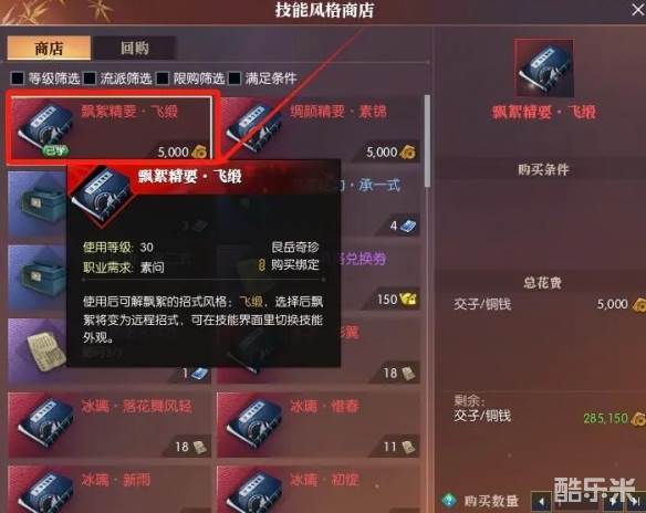 2、在商店里找到【飘絮精要·飞缎】花5000交子/铜购买;