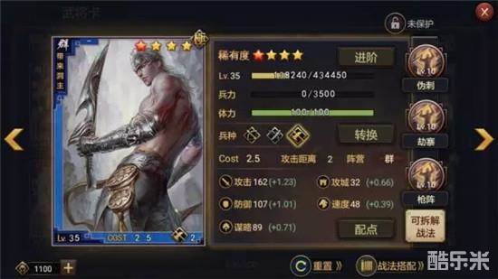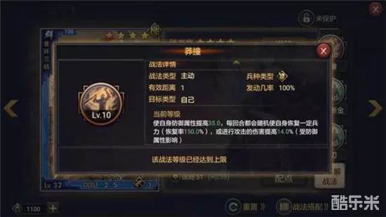 金环三结的自带战法是100%发动,也就是说每回合能加上35防御,并且有机会恢复一定兵力,这是一个攻守兼备的技能,但它的弱点在于两个效果只能触发一种,不能准确的给他定性是防御位还是攻击位,不过作为前排还是比较合适的。