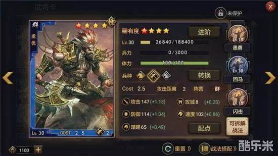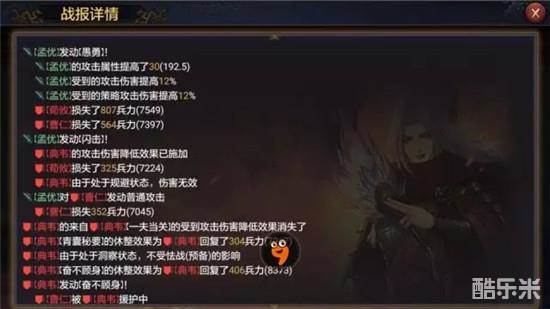 孟优的技能能给自己提升30点攻击力,这对弥补他贫弱的成长有一定的作用,但12%的伤害提高就显得很刺眼了,本身防御力就不高,这样很容易导致自身过于脆弱,附带的群体伤害还是比较客观的,毕竟是不需要准备回合,伤害也高达210%。如果以他为输出位,需要带一定的技能来保护他。