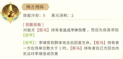 当局势变得更加复杂时,李靖的觉醒技能【朔方靖阵】便展现出了他无与伦比的控制力。在敌人持有【拒马】的情况下,李靖会施放强力的单体攻击,并为自己添加【肩甲】。这个【肩甲】真实的效果是:李靖在受到群体攻击时,会有生命恢复的效果。而且,如果敌人持有【拒马】的单位数量超过1,李靖还会在己方回合内使敌人无法对自己造成伤害。这种技能不仅大幅度提升了李靖的生存能力,还能有效牵制敌人的攻击节奏,配合队友打出反击的机会。