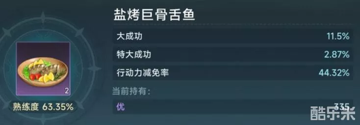 成品盐烤巨骨舌鱼可恢复120点行动力,是常规料理的3倍效果。战斗前使用可使舰队获得饱食状态,24小时内海战伤害提升8%。多余成品可挂海市交易,单价建议设定在4.5万-5万金币区间,注意每日交易税率为15%。保留3-5份用于紧急任务,如幽灵船讨伐或遗迹探索。