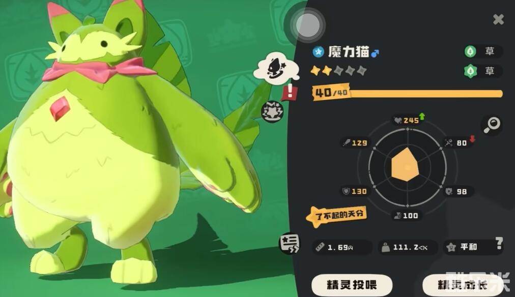 魔力喵种族值总和为606,物理防御(109)与精力(生命值)较为突出,魔法攻击(88)相对薄弱,定位偏向物理抗伤与消耗型辅助。氧循环与技能光合作用可以联动每回合回复生命并叠加光合印记,建议优先提升物防与精力属性,增强战场存活率。性格推荐沉着(加魔防)或大胆(加物防),天赋优先物防、精力与魔抗。