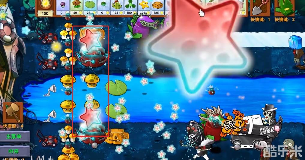 每隔一段时间可以生成一个大星星,向僵尸方向落下,变成几十颗星星攻击。