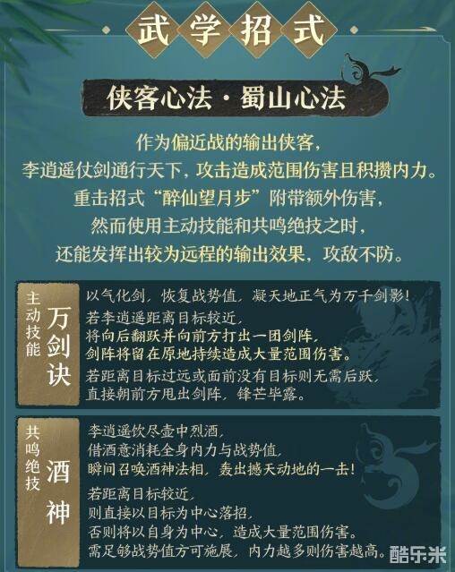 李逍遥是剑网3推出的全新侠客,那么该角色的武学技能是怎样的呢,侠客心法为【蜀山心法】,攻击会造成范围伤害并且每一次攻击都将积攒内力,侠客的内力值达到一定程序可使用【共鸣绝技·酒神】。接下来就由酷乐米小编给大家带来了详细的《剑网3》侠客李逍遥武学技能一览!