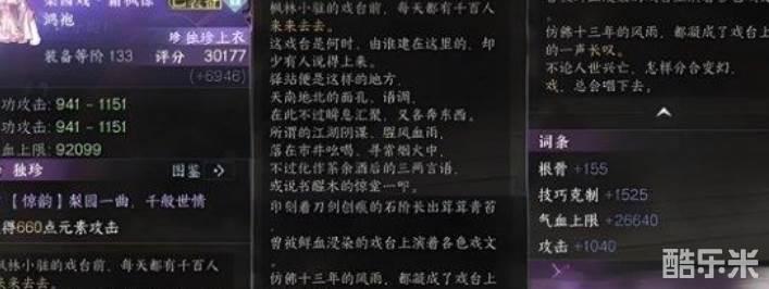 1、133装等独珍上衣,独珍属性是660全元素攻击,基础词条给的是PVP和PVE环境通用的技巧克制。