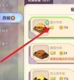 3、最后在菜谱中筛选西餐找到姜汁牛排,点击美味升级即可;