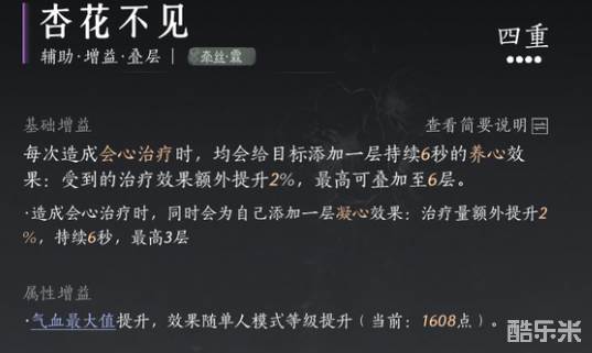 最后一个心法要么选择杏花不见,4重即可,既能加气血最大值,又能提升奶量。