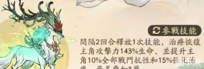 参战技能:间隔2回合释放1次技能,治疗恢复主角攻击力143%生命,并提升主角10%全部战斗抗性和15%强化治疗,最多叠加3层。