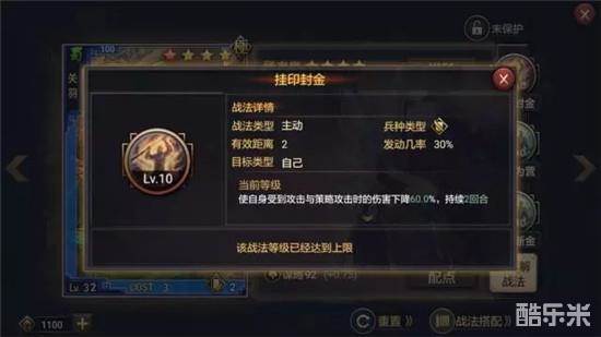 然后我们再来看看他的主动战法,满级时30%几率发动,使自己受所有伤害下降60%持续2回合。效果上来说这个战法无可挑剔,能大幅增加前锋的硬度,几率上中规中矩。而本次我们要推荐的并不仅仅是蜀关羽,而是他和步步为营的组合。