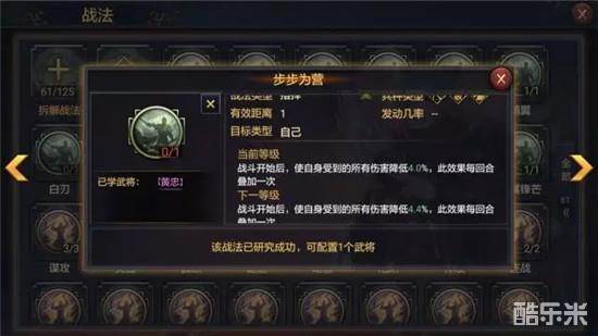 步步为营的满级效果为使自身受到的伤害降低8%,每回合叠加一次。这个战法在修改过后显得没以前实用,因为他从启动到效果够看需要四个回合左右的准备时间,如果单独使用的话很容易前期就被打爆。但是蜀关羽自身就有一个防御性机能,与之产生配合的话很容易支撑到中期步步为营效果叠加到可观程度的时候,而步步为营又可以弥补主动战法的空窗期,二者互相补足又不会冲突。