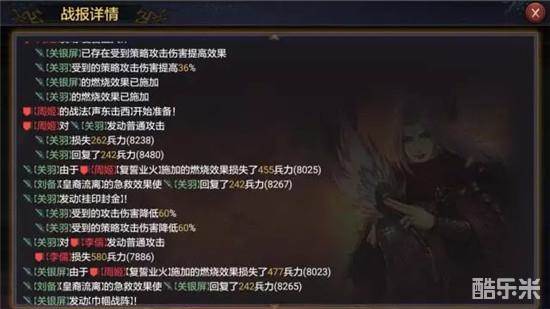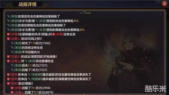 这里可以看到后期的关羽减伤强势之处,谋将的火大法打在身上只掉了70兵,恢复量都超了这个数字的3倍。楚歌四起的伤害也几乎可以忽略不计,如果脸好的话这个阶段关羽的兵很容易越打越多。