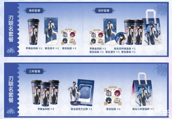 3、三杯套餐:苹果金凤梨×3、联名亚克力立牌×1、联名贴纸×1、联名三杯保温袋×1。