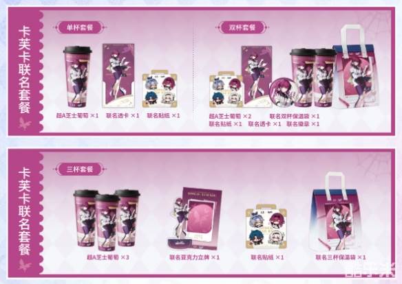 2、双杯套餐:超A芝士葡萄×2、联名双杯保温袋×1、联名透卡×1、联名贴纸×1、联名徽章×1。