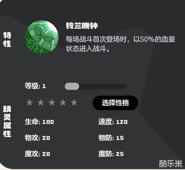 鳗尾兽是一种种族值为774的地系和草系精灵,鳗尾兽的特性名为铃兰晚钟,在每一场战斗中,鳗尾兽第一次登场的时候,都会以自身50%的血量为基础进入到战斗中。