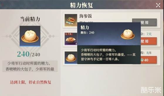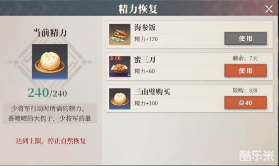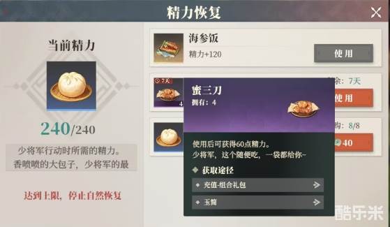 游戏中体力值的上限是240点,如果超出这个上限,多余的精力将会溢出并浪费掉,因此在使用恢复道具时,一定要计算好自己的体力值,然后还有蜜三刀,相对来说蜜三刀还是要好获取一些,当然在充值的组合礼包以及玉简当中也能获取,使用蜜三刀后将获得60点的精力恢复,虽然相较于海参饭来说数值较少,但在紧急情况下也能解燃眉之急。