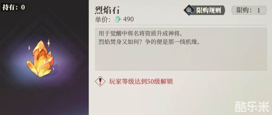 后期大家如果想要对自己的武将进行提升,就要用到这个道具,不过需要大家先升级到50级才可以用,这仅仅是满足了获取该道具的基础门槛而已,当玩家达到这一等级要求后,还需要花费一定数量的灵犀玉来购买,其单价设定为490灵犀玉,并且这还不是可以无限制购买的,而是有着严格的限购措施,玩家一次只能购买一个烈焰石,只有在商店刷新之后,才有机会再次进行购买。