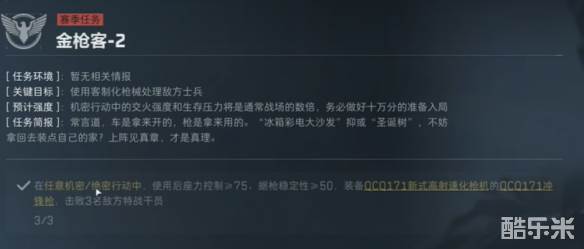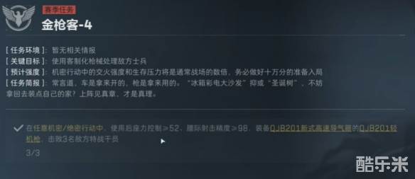 三角洲行动s4赛季中加入了全新的金枪客的任务,那么这些任务要怎么改枪呢?这里就为大家整理了金枪客1-6任务的改枪的方式,大家可以按照这些改枪码来改装符合要求的枪械来完成任务,接下来就由酷乐米小编给大家带来了详细的《三角洲行动》s4金枪客改枪方案一览!