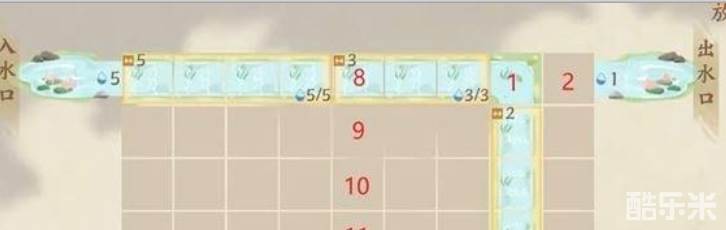5、在9、10、11、13、14的位置分别放置水量承载为2的直道。