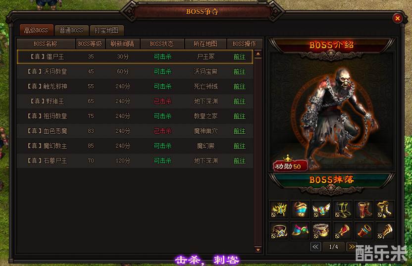 每隔一段时间在野外固定地点刷出野图BOSS,点击寻路前往,所有玩家可以参与争夺,BOSS掉落大量极品装备,商城道具等;