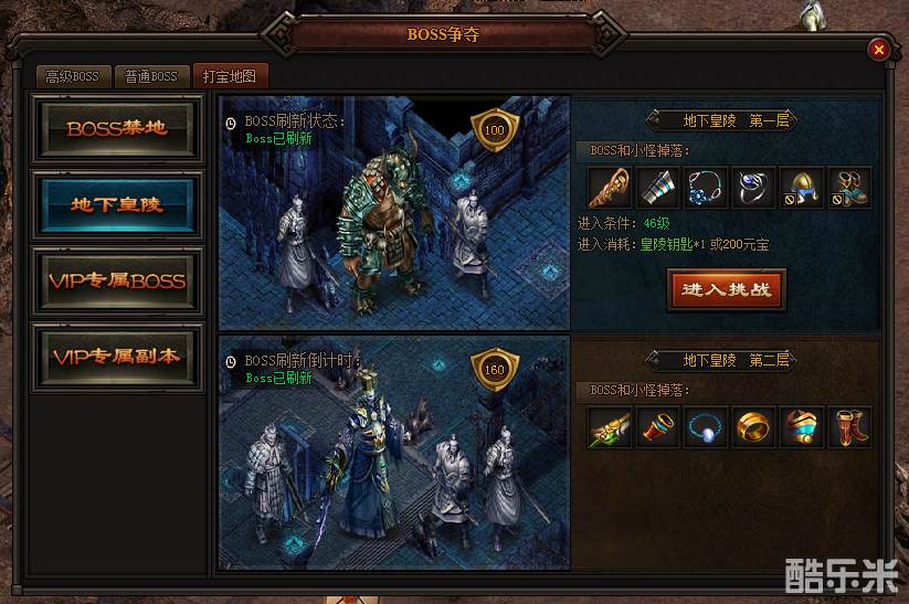 极品产出地图,掉落率远高于野图。地下二层(60级)需要皇陵钥匙进入,击杀一层怪物有几率获得皇陵钥匙。