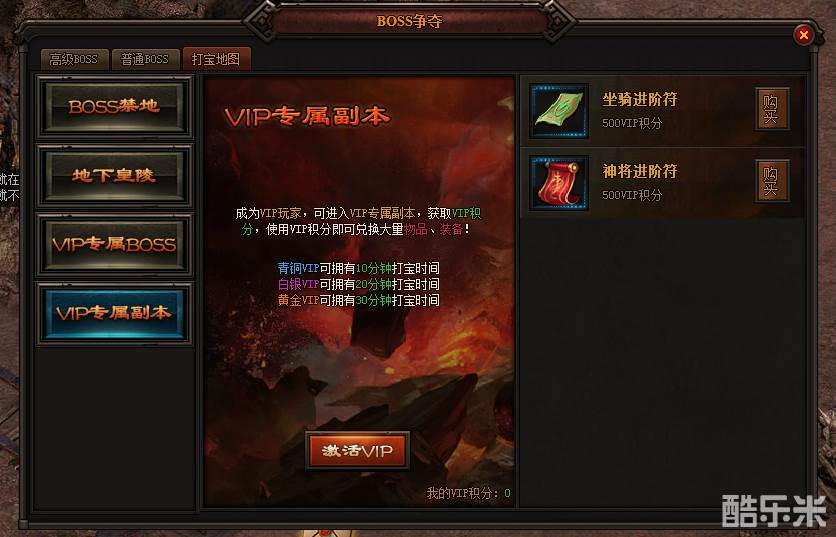 VIP玩家专属地图,击杀怪物可以获得积分,积分用来兑换各种商城道具。