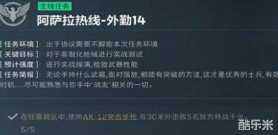 角洲行动中战术部门外勤14任务需要玩家们前往任意战区,通过使用指定的突击步枪在一定的距离外击杀五名敌人即可完成,接下来酷乐米小编为大家带来详细的攻略,感兴趣的伙伴们千万不要错过啦。