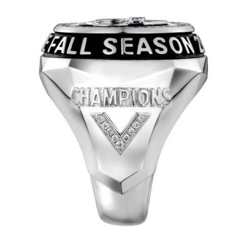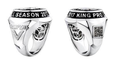 以全满钻镶嵌打造出象征最高荣誉的王者之戒,正面圆形的设计,加上灿若繁星的黑、白钻石簇拥中间的标志,诠释圆满团结的战队精神。