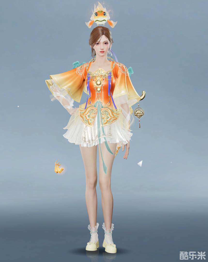 灯影流转,光华映月!「花灯影」时装包含衣服、鞋子、发饰三个部分。女款头顶一尾小金鱼,灵动可爱,给整体造型增添一丝俏皮感。上身设计融入中国传统的绣样,细腻而精致。下身是短款的马尾裙,既显得活泼又富有现代感,完美诠释了“古典与时尚并存”的独特魅力。