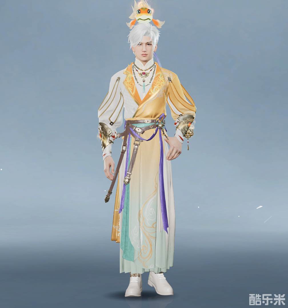 男款同样搭配一尾小金鱼的发饰,仿佛在夜空中跃动,寓意着吉祥与好运。整体服装采用中国传统的圆领袍设计,领口绣有精致的纹样,展现出古韵十足的优雅。