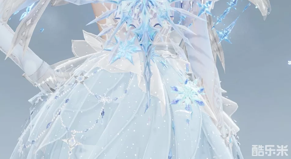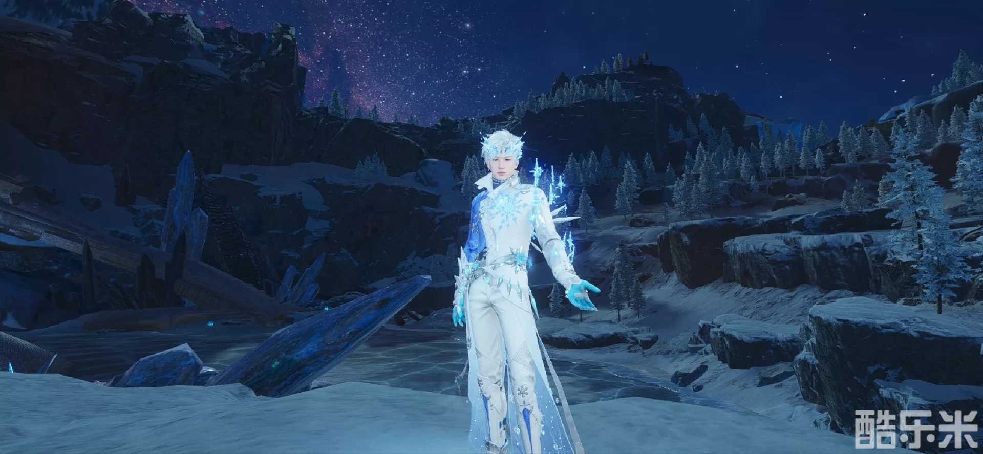 男款上装采用蓝白拼色设计,彰显冷冽与优雅的双重气质。胸口点缀精致的冰晶装饰,宛如冬日寒霜凝聚出的艺术品,下摆轻柔的白纱融入雪花图案,随步伐微微摆动带起一阵寒冬的微风。额前的冰晶发饰更是点睛之笔。