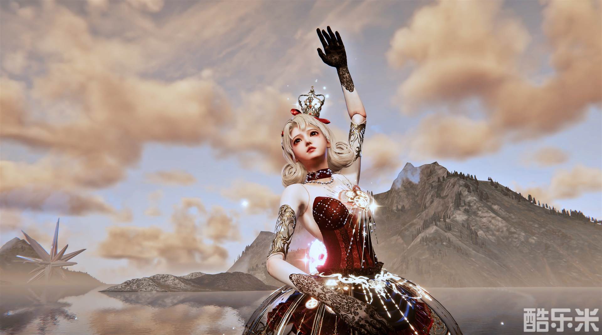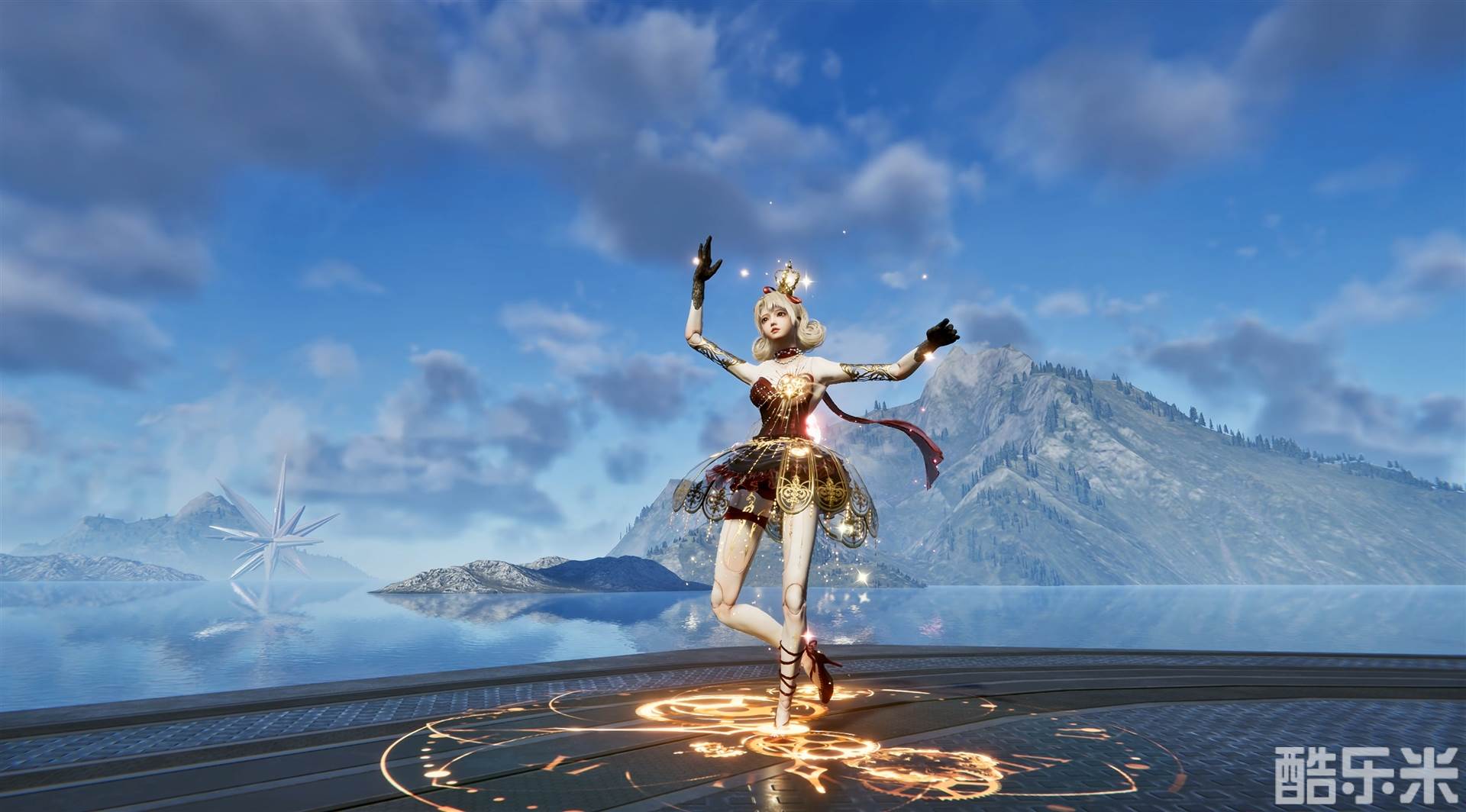 下摆层叠的红色纱布宛若盛放的玫瑰,裙摆两侧点缀着精致的黄金雕花裙撑,增添了一丝华丽的宫廷气息。搭配绑带的红色舞鞋,仿佛下一秒就要旋转在舞台中央。