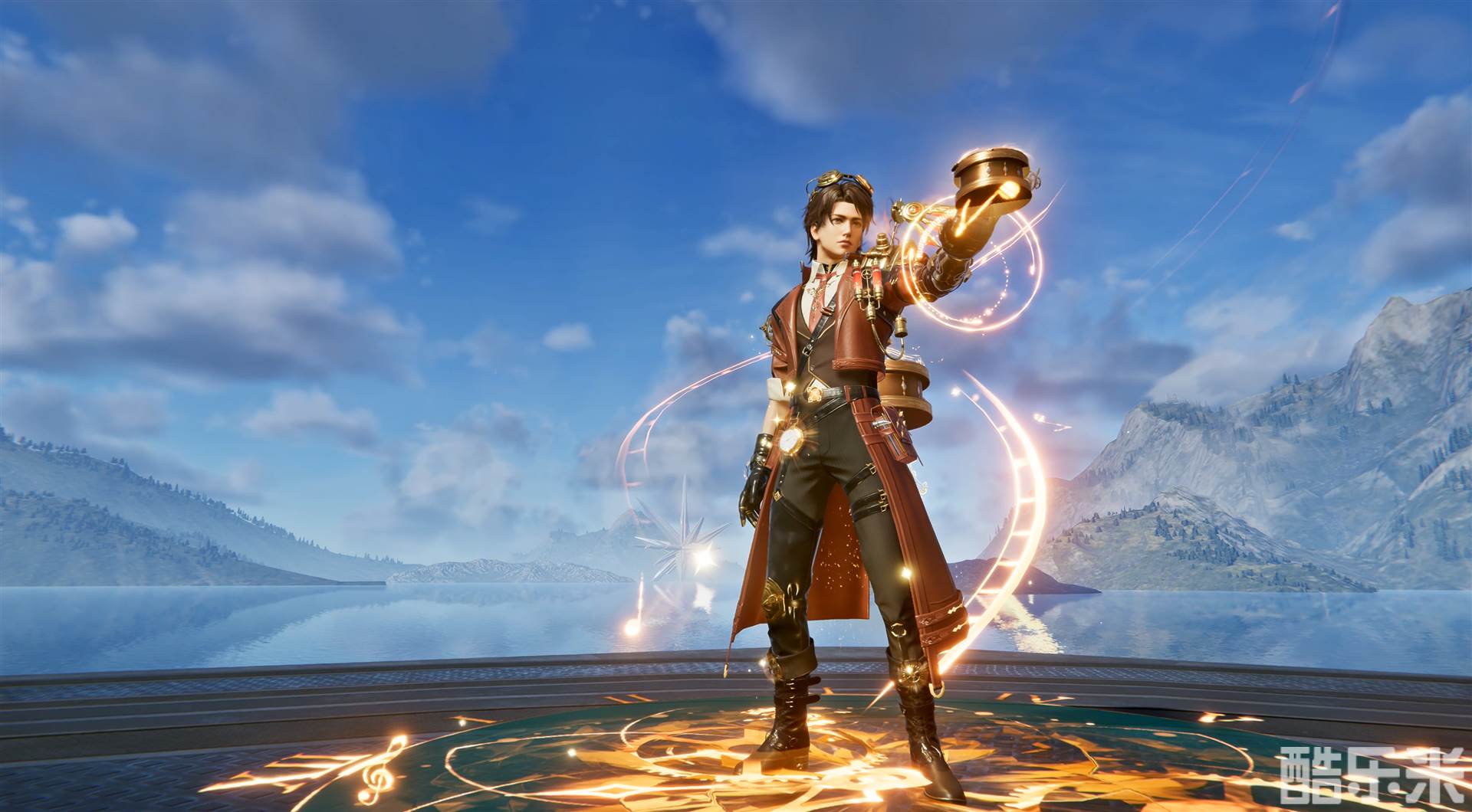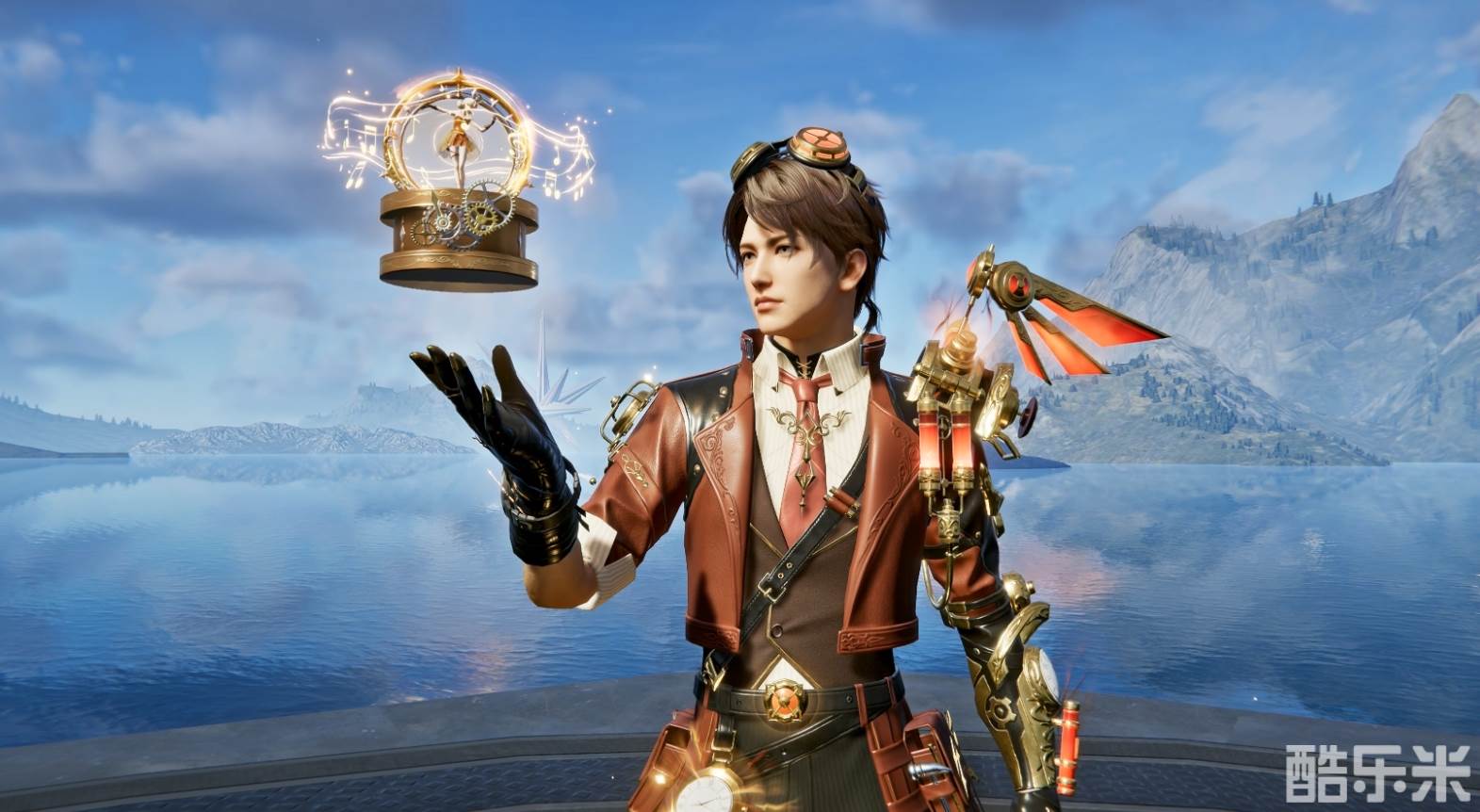 男装整体呈现人偶机械师风格,干净利落的短发上戴着机械眼镜,红色的短款外套搭配棕色马甲,简约又不失质感。左臂上的机械翅膀,显得硬朗又帅气。