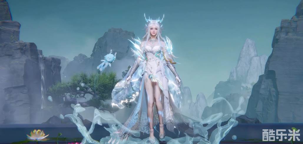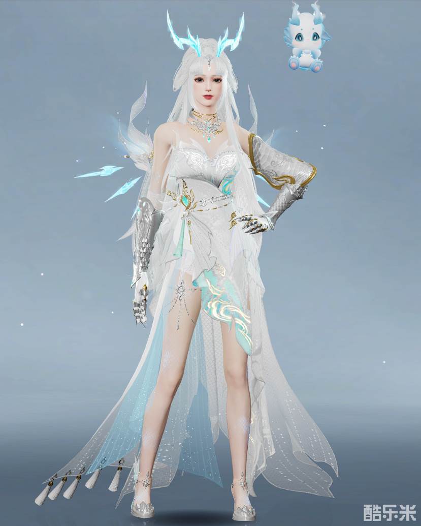 女款采用了抹胸长裙的设计,柔美与威严并存,蓝色云纹缠绕,手臂处的银色装饰更是增添了战斗的力量感。额头的蓝色蛟角和背后逸动的澜影构建了一个充满魅力的神女形象。
