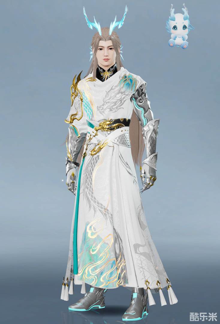男款时装设计汲取了汉服的精髓,全身银纹刺绣流光溢彩,象征着力量与荣耀。手臂处的盔甲更增添了几分刚毅与威严,额头上的角巧妙地融入整体造型,尽显尊贵与神秘,将神兽的威严与气势展现得淋漓尽致。