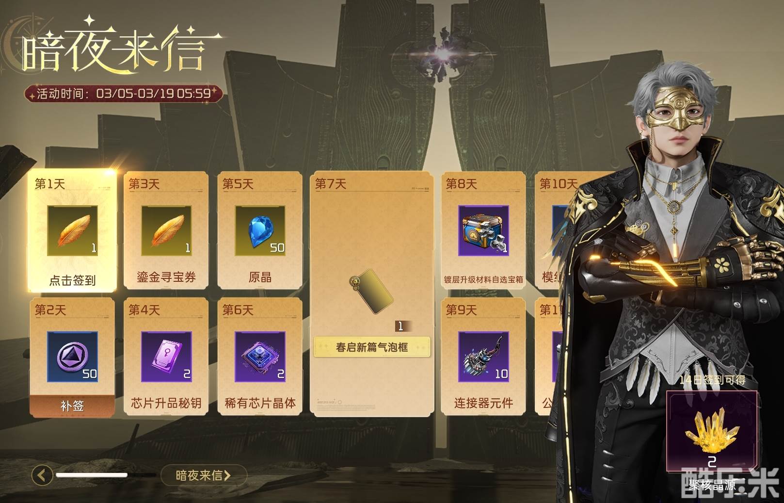 暗夜来信,惊喜连连!活动期间登录签到,即可领取鎏金寻宝券、春启新篇气泡框、稀有芯片晶体、镀层升级材料自选宝箱等丰富奖励,签满14天更可直接领取聚核晶源!每位幸存者都有3次补签机会哦~