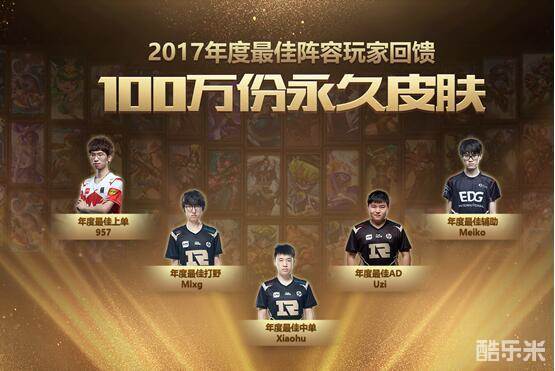 同时,年度最佳阵容的选手也给各位召唤师们带来了奖励回馈。在12月2日11:00~12月3日23:59期间,参与2017英雄联盟年度最佳阵容玩家回馈活动,即可领取1款皮肤奖励(永久皮肤或7天体验皮肤)