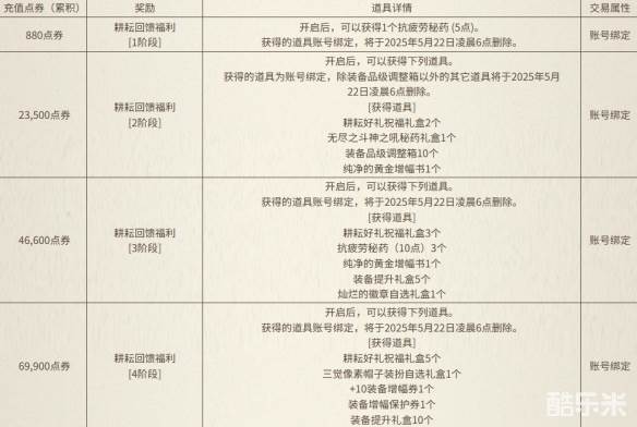 2、本次充值活动将于2025年5月22日凌晨6点结束,有时限的充值奖励也将于2025年5月22日凌晨6点删除。