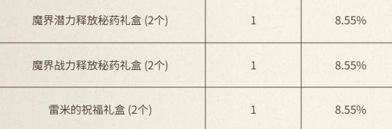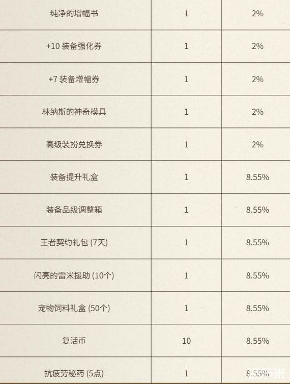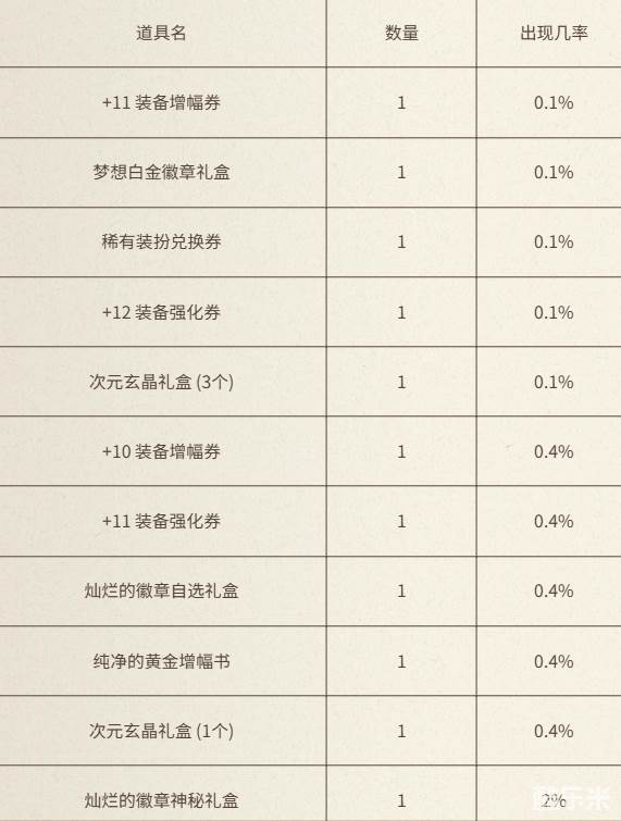 3、【耕耘好礼祝福礼盒】内的奖励是随机的,打开后有概率获得+11 装备增幅券、梦想白金徽章礼盒等。