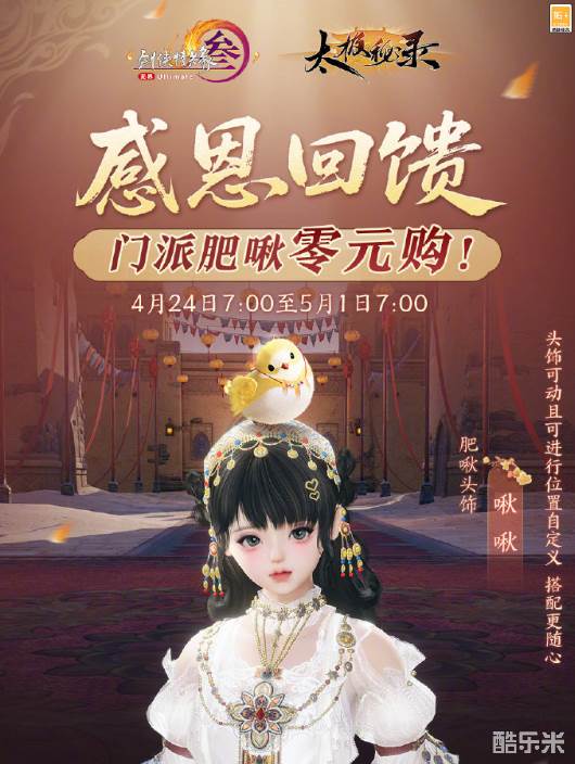 剑网3新赛季感恩回馈活动在4月24日正式开启,那么该活动内容是什么呢,玩家等级达到满级后在活动期间登录游戏即可获得1张【肥啾零元券】折扣券,使用折扣券在商城可免费购买【肥啾头饰】,折扣在5月1日结束。接下来酷乐米小编给大家带来《剑网3》新赛季感恩回馈活动介绍!