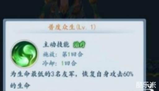 此外女娲还有一个比较特殊的主动技能“舍身济世”,给血量最低友军治疗,同时为其增添一个存在2回合持续回血效果,第一次回血效果与女娲攻击挂钩,持续回血效果与女娲生命值挂钩。有了这两个主动技能,女娲的保人能力便有了保障。