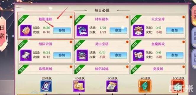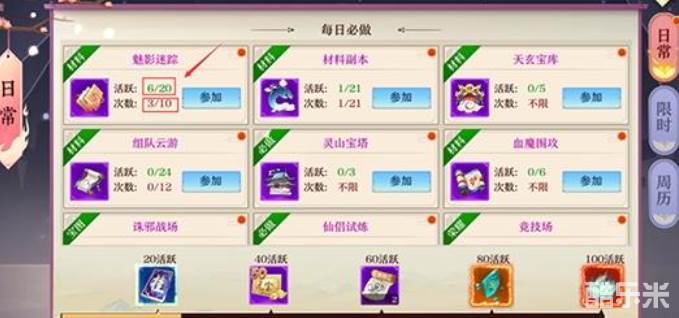 (参加了魅影迷踪3次,获得了6点活跃度)