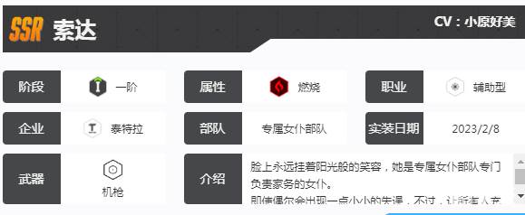 索达总是会面带灿烂的阳光能有效驱散一切。在专属的女仆部队中主要就是一个女仆,虽然有时候会有一些小失误,但并没有影响到给身边人带来温暖。