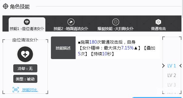 从技能这一方面来看,普通的攻击就是机枪扫射,每一次攻击可以给目标造成5.57%的伤害。座位清洁女仆就是被动技能,在施展180次复通攻击之后,自身就可以获得女仆精神效果,能有效提升7.15的体力,最多就可以叠加5次。地面清洁女仆是一个主动技能,冷却时间为12秒,可以有效恢复全体队友的体力。
